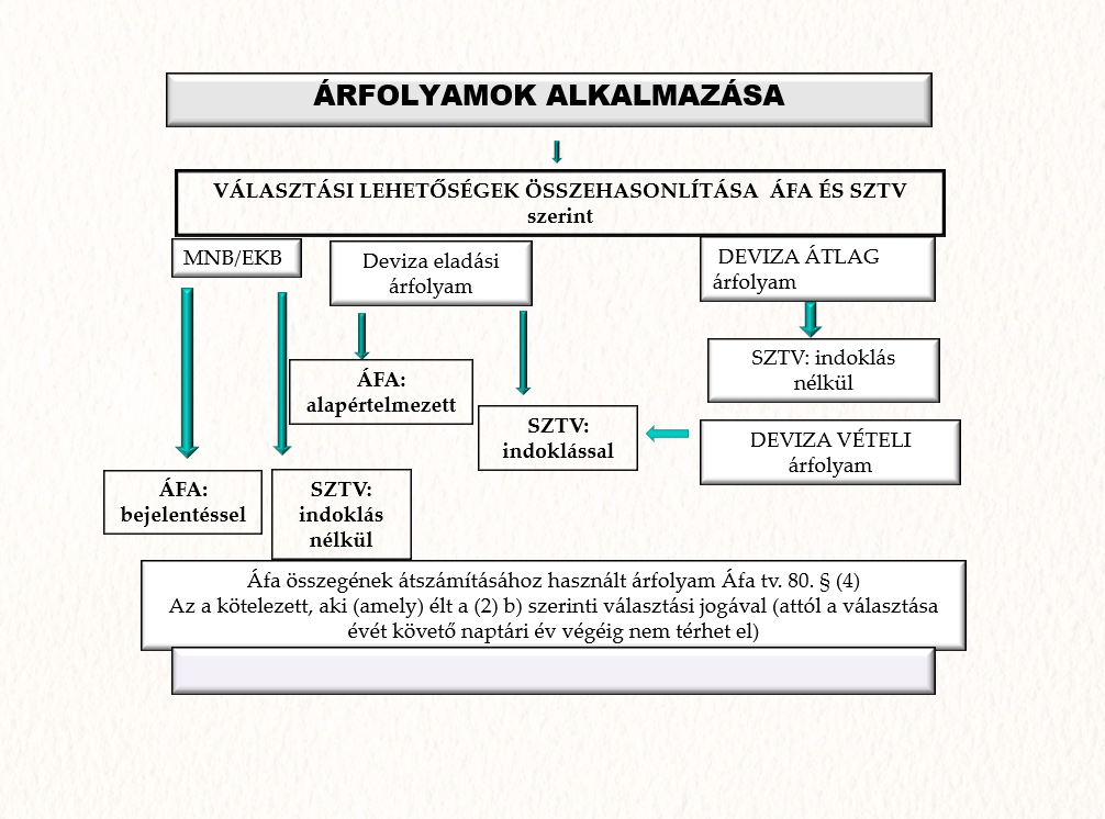 Az alábbi táblázatban összefoglaljuk az ÁFA törvény és a Számviteli törvény előírásaiból adódó lehetőségeket az átszámításhoz alkalmazott árfolyamokra vonatkozóan – 1. tábla